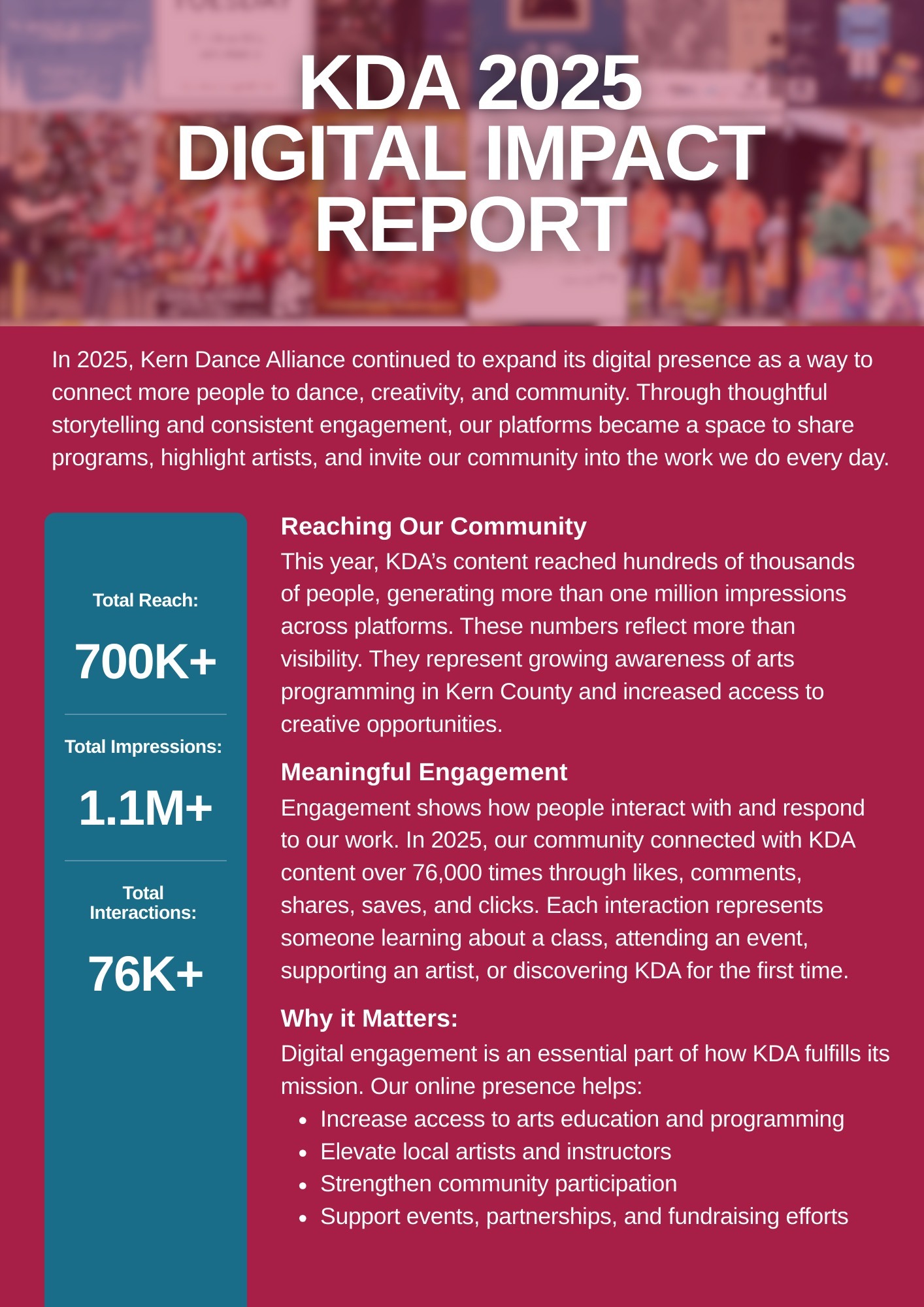 As KDA celebrated our 10th anniversary, 2025 became a year we will always hold close to our hearts. What began ten years ago as a small dance nonprofit rooted in passion and service has grown into a nationally recognized organization using the arts to strengthen education, health, advocacy, and community connection across our community. This year was not only a celebration of where we have been, but a defining moment in shaping where we are going.